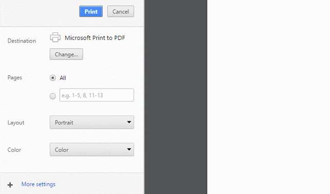 Siin on oluline valida 'Destination' alt õige printer ja 'More settings' alt saab peita üleliigsed päised ja jalused, valida veelkord värvi jne. Prindi eelvaates saab veenduda, et kõik on korras ja seejärel vajutades nuppu 'Print' saadetakse fail printerisse.