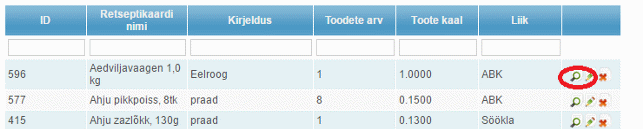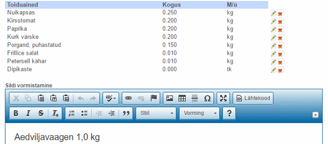 Nüüd on sildi vormistamiseks andmed kogutud, toiduained on järjestatud kahanevas järjekorras koguste järgi ja sildi pealkirjaks on pandud retseptikaardi nimi.